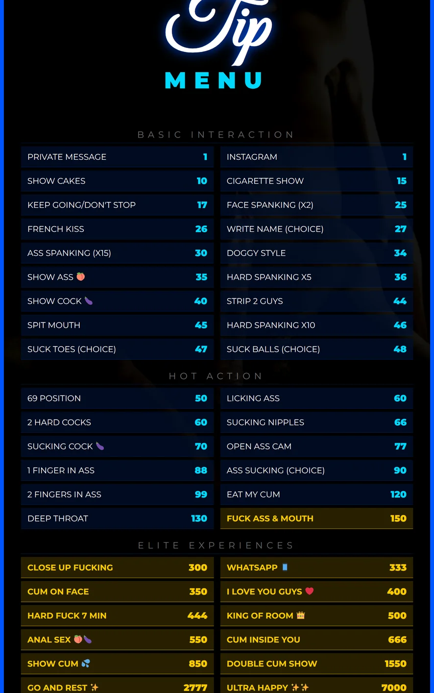 A Cuatro, Anal, Autofelación, Azotes, Baile Erótico, Ahegao, Corrida, Dedos, Eyaculación, Fetichismo de Pies, Fumar, Garganta Profunda, Beso Negro, Del Culo a la Boca, Juguetes Sexuales, Juguetes Anales, Masturbación, Mamada, Show con Aceite